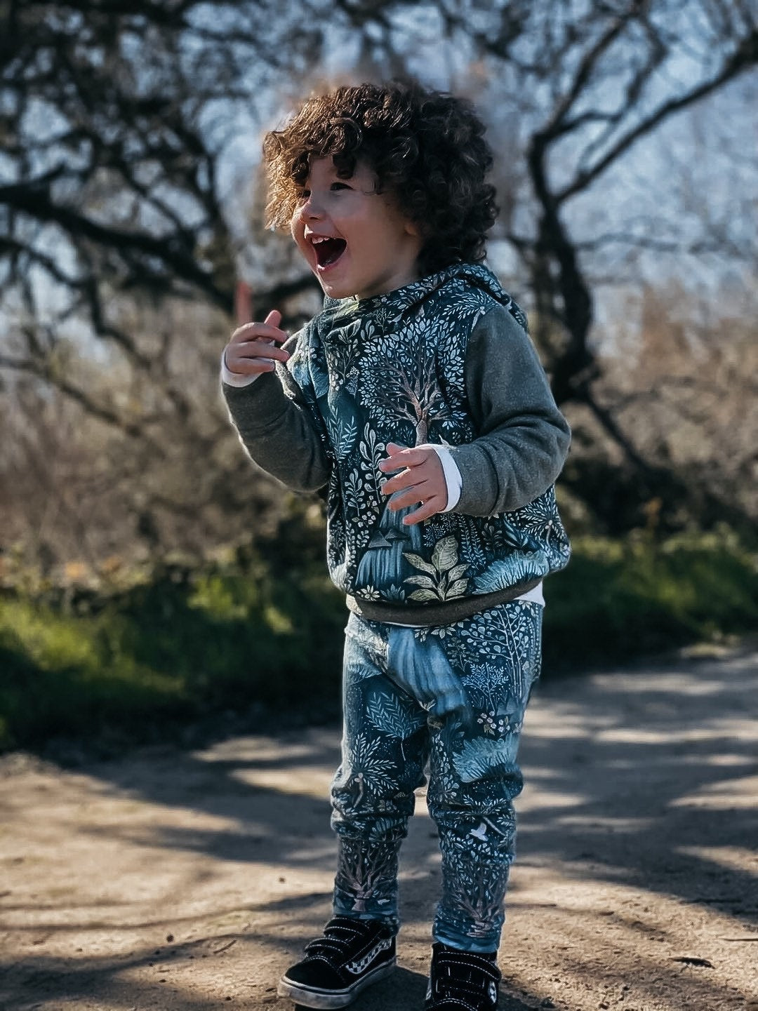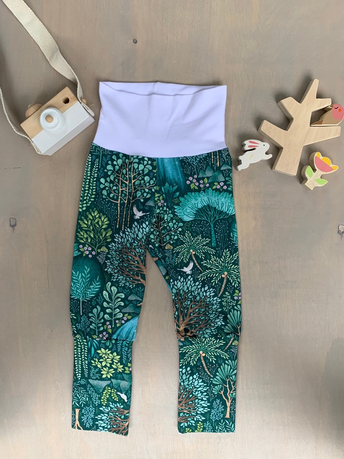 Gender Neutral Grow With Me Slim Pant in Emerald Eden These pants are meant to grow with your child. Made out of a Stretch Cotton & French Terry that is super soft and luxurious feeling against your little one’s skin, getting softer with each wash. Cuffs and waistband can be folded over and extended as the child grows, these pants are meant to fit through seasons of exploring and play.