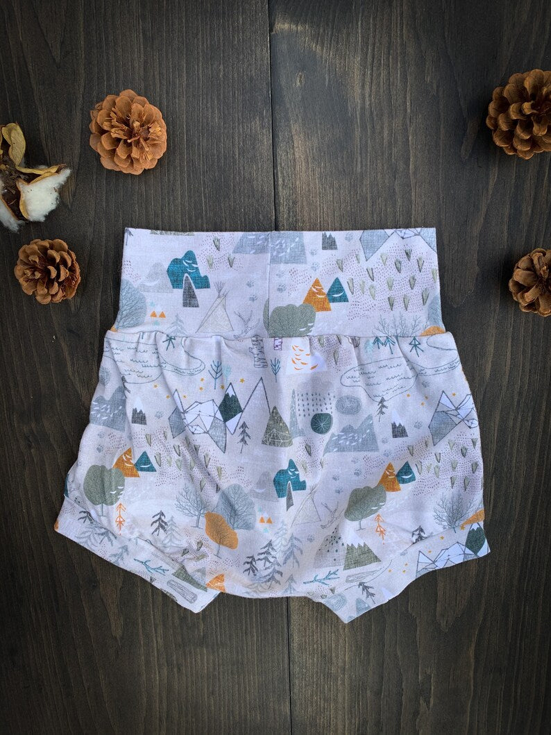 Gender Neutral Shorties in Mountain Adventure These shorties are meant to grow with your child. Made out of a Spandex Cotton that is super breathable and luxurious feeling against your little one’s skin, getting softer with each wash. Waistband can be folded over and extended as the child grows, meant to fit through seasons of exploring and play.