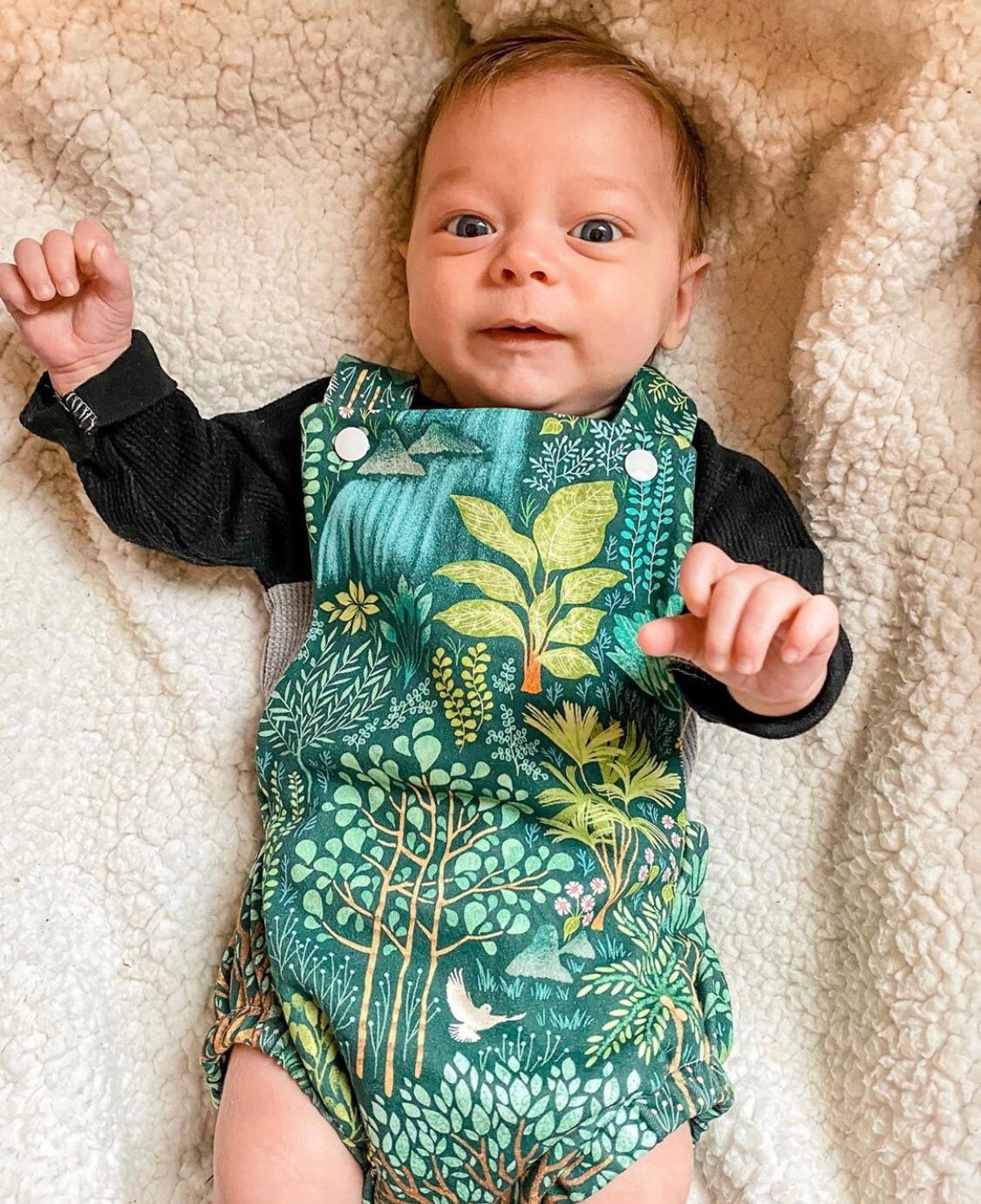 Baby + Toddler Organic Cotton Bubble Romper Playsuit in Emerald Eden This romper is made out of a buttery soft, breathable organic cotton that gets softer with each wash. Entire front is lined with a super soft bamboo French terry. This will be a staple in your little one's wardrobe. Can be worn alone in warmer months or with blouse or tee and tights underneath during cooler months.
