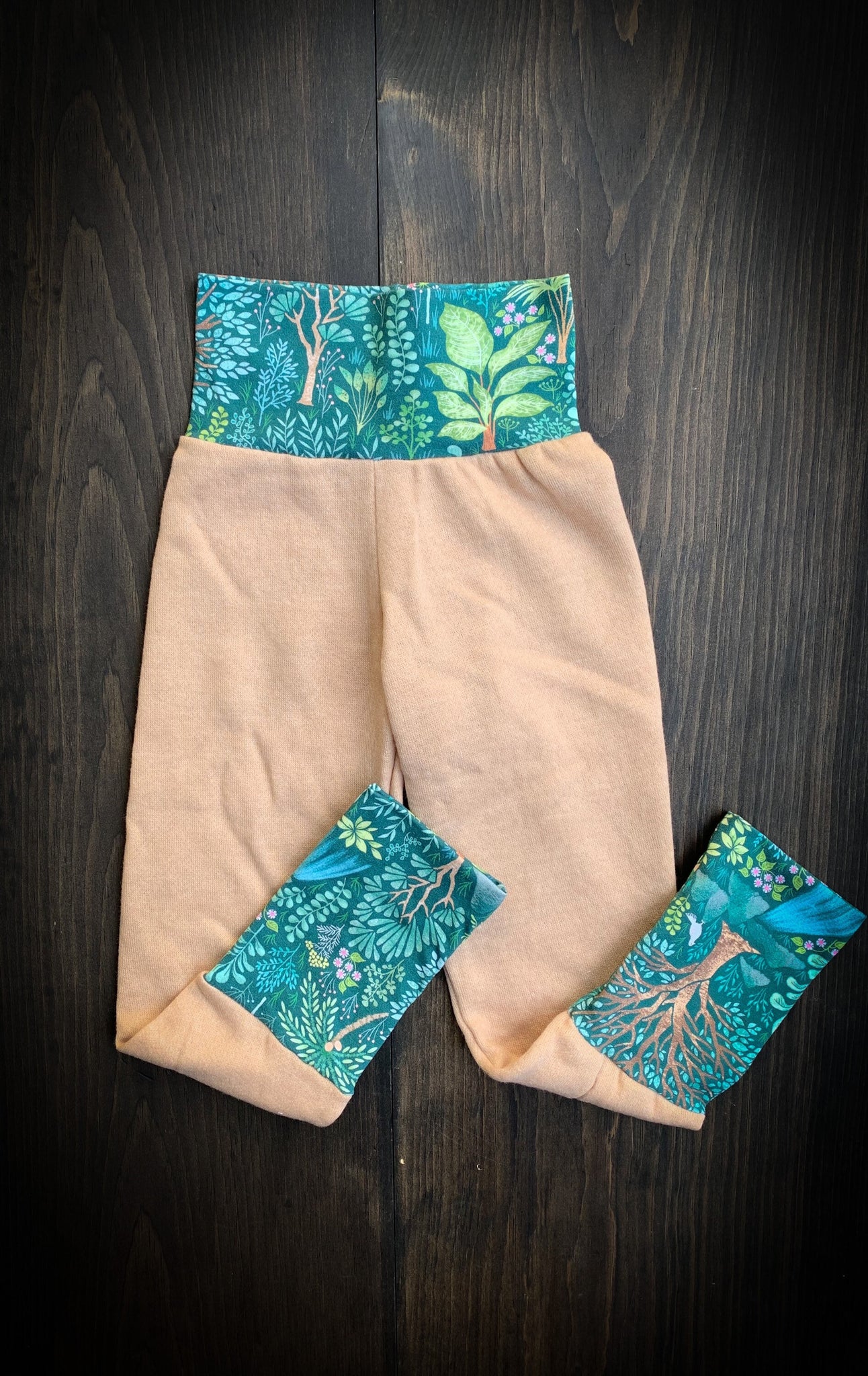 Gender Neutral Grow With Me Slim Pant in French Terry & Emerald Eden These pants are meant to grow with your child. Made out of a Stretch Cotton & French Terry that is super soft and luxurious feeling against your little one’s skin, getting softer with each wash. Cuffs and waistband can be folded over and extended as the child grows, these pants are meant to fit through seasons of exploring and play.