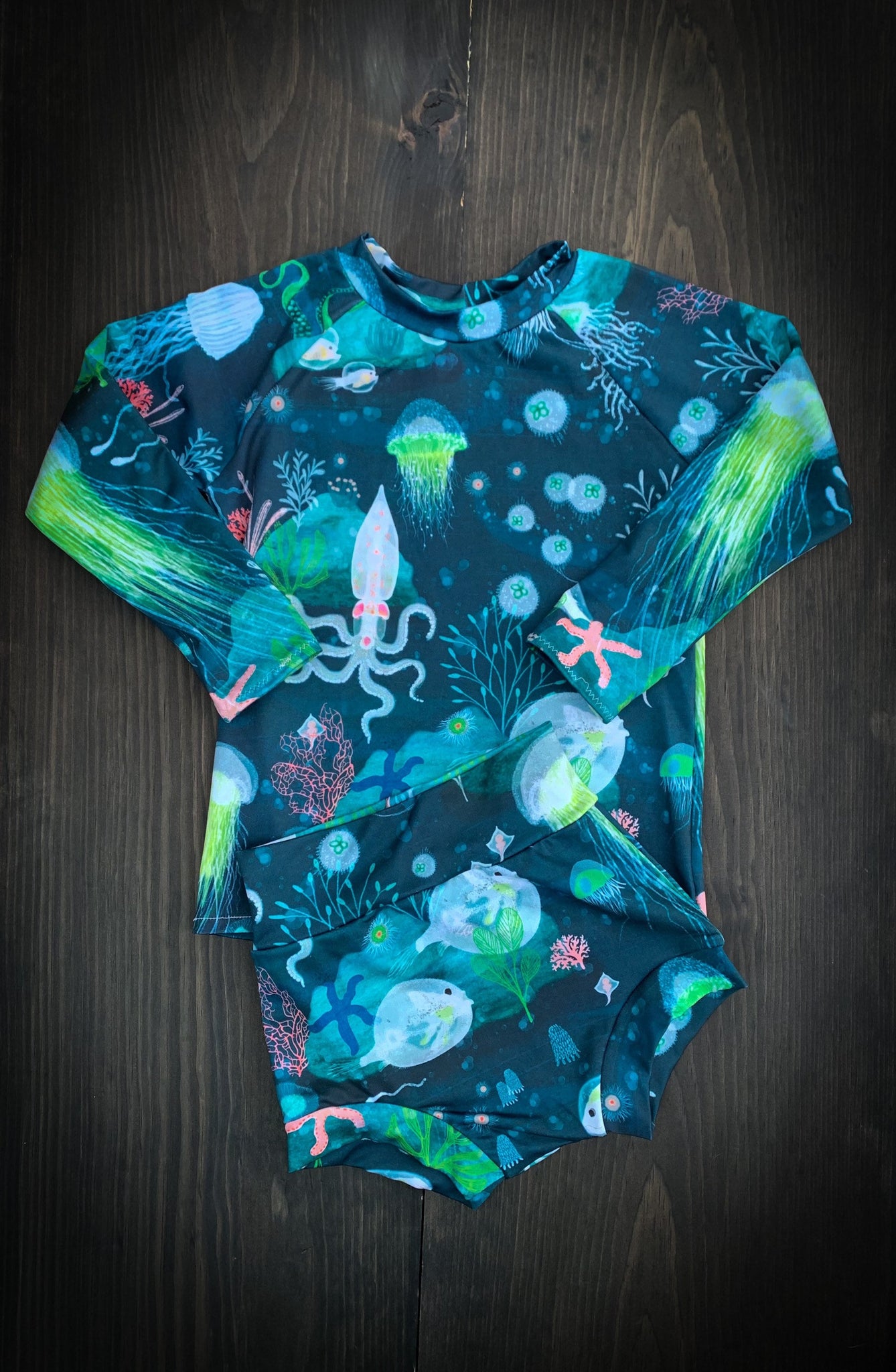 The Baja Rashguard will be a staple in your little one’s wardrobe during the Summer months. Made out of the silkiest medium weight, sports Lycra (swim material) perfect for keeping your little one cool and protected from UV rays. Elastane fibers such as Lycra & Spandex are rated highest on the UPF protection scales and are excellent choices for blocking out UV rays due to their tightly woven fibers.