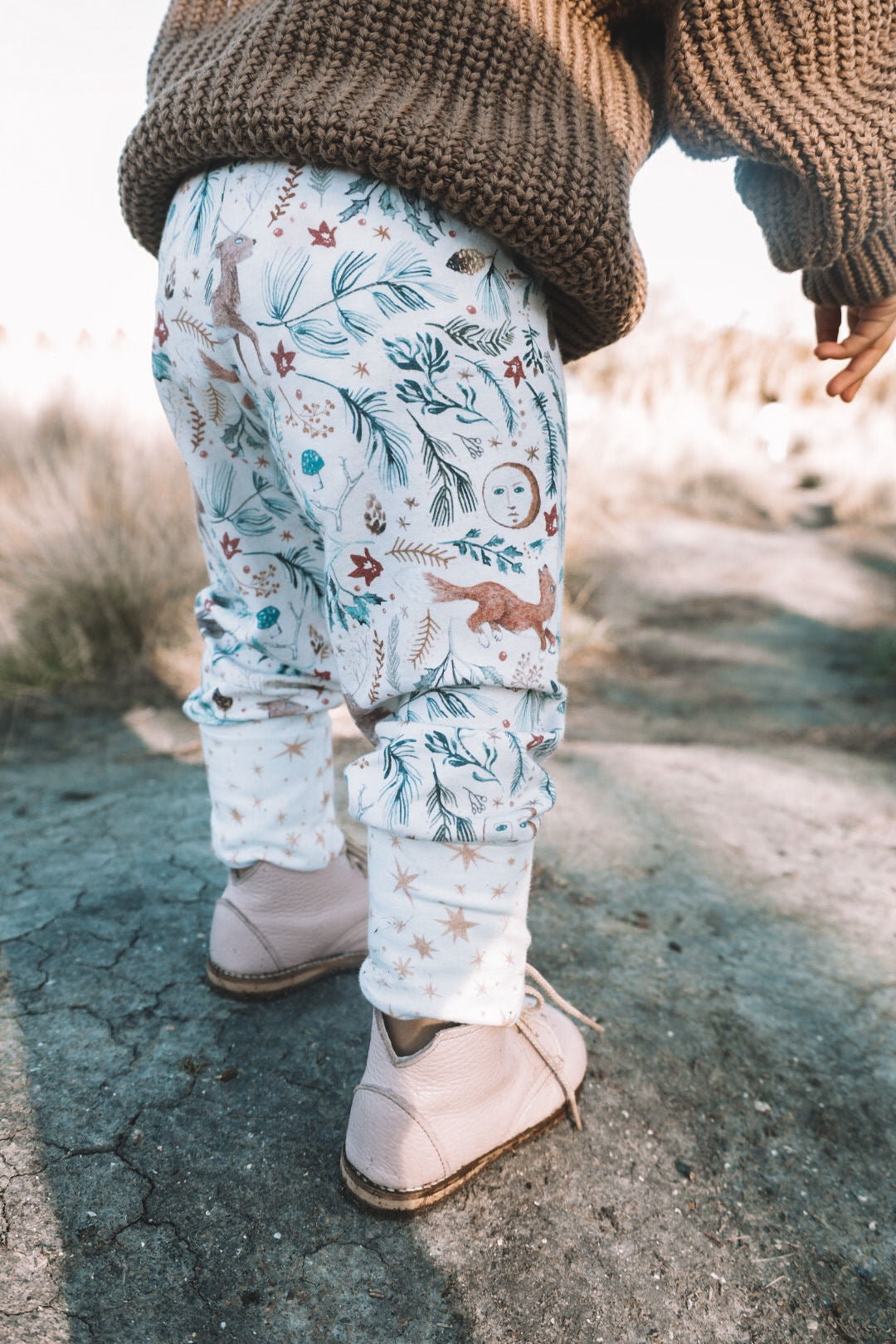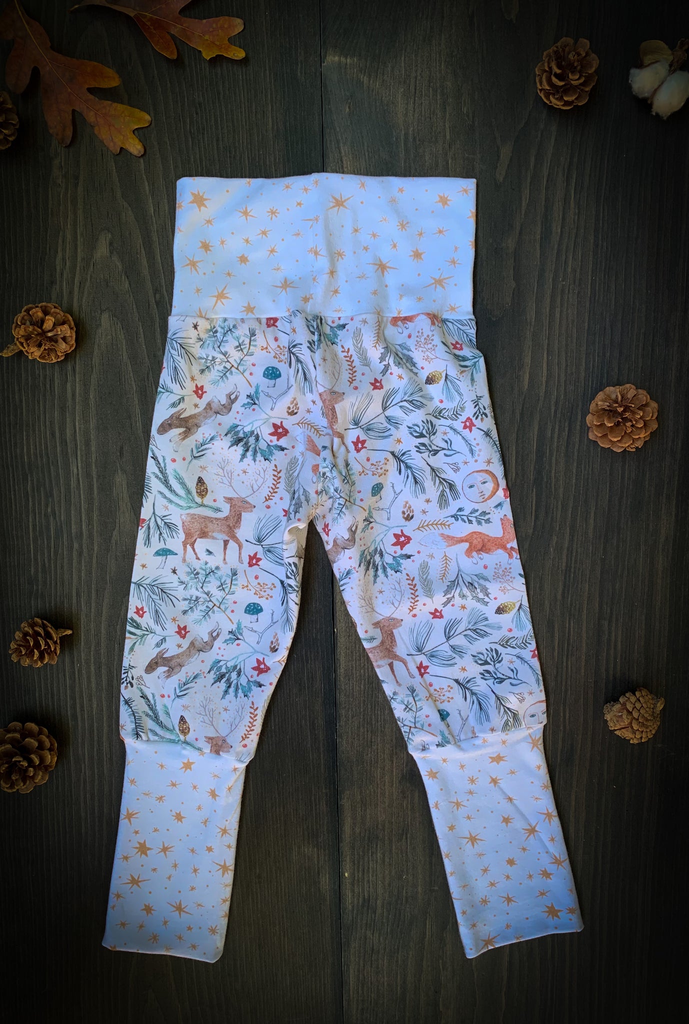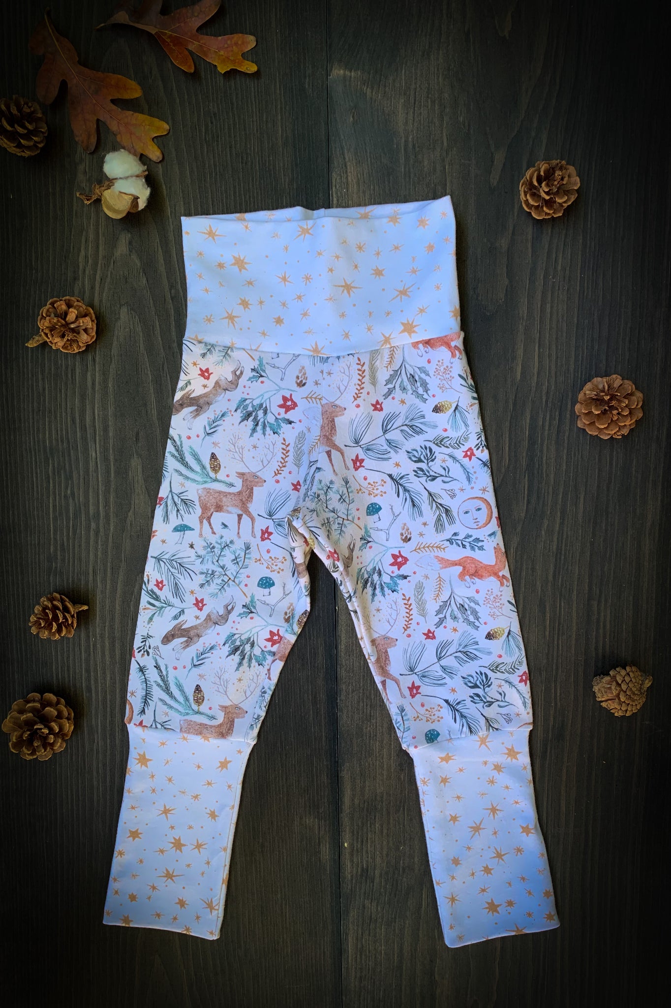 These pants are meant to grow with your child. Made out of a Cotton Spandex Jersey that is super soft and luxurious feeling against your little one’s skin, getting softer with each wash. Cuffs and waistband can be folded over and extended as the child grows, these pants are meant to fit through seasons of exploring and play.