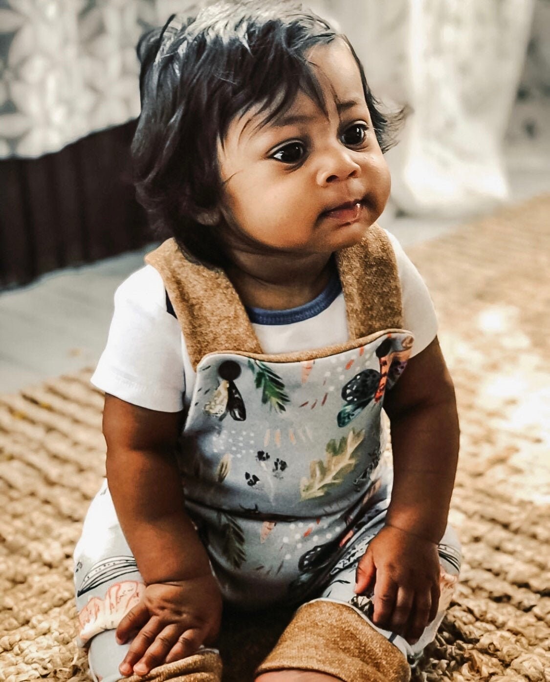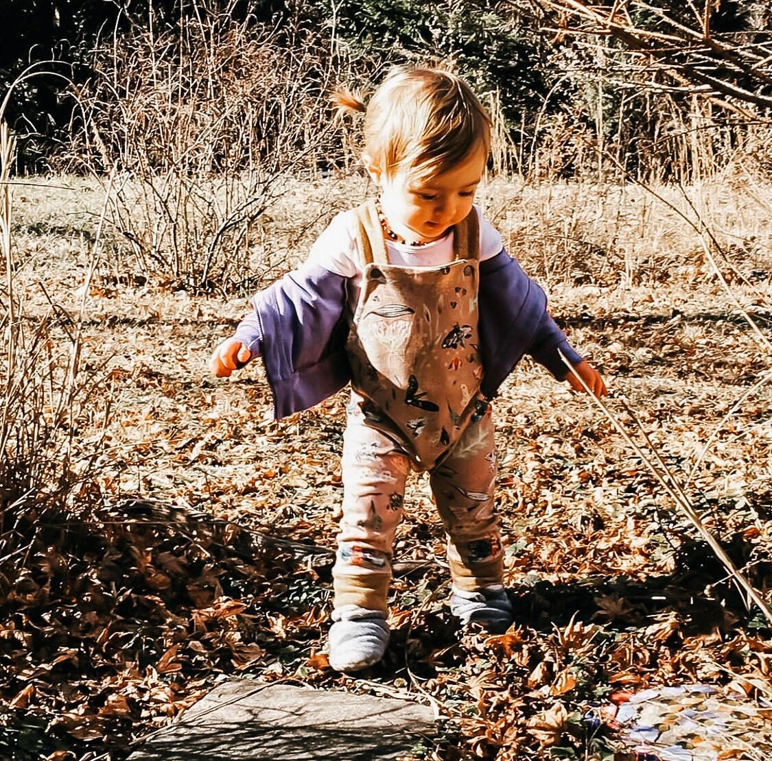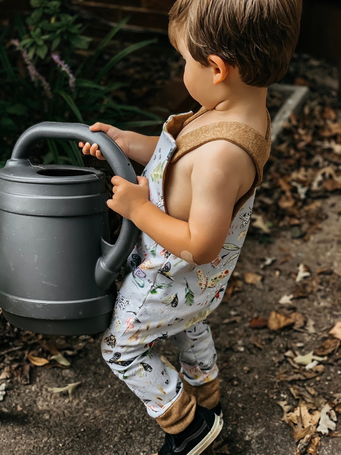 Baby + Toddler Organic Cotton Long Romper Playsuit in Autumnal Moths This romper is made out of a buttery soft, breathable organic cotton that gets softer with each wash. Drpped crotch for a roomier fit. Top front and back bodice is lined with a super cozy French terry, as well as straps and cuffs. This will be a staple in your child's wardrobe. Can be worn alone in warmer months or with blouse or tee underneath & layered with a sweater during cooler months.