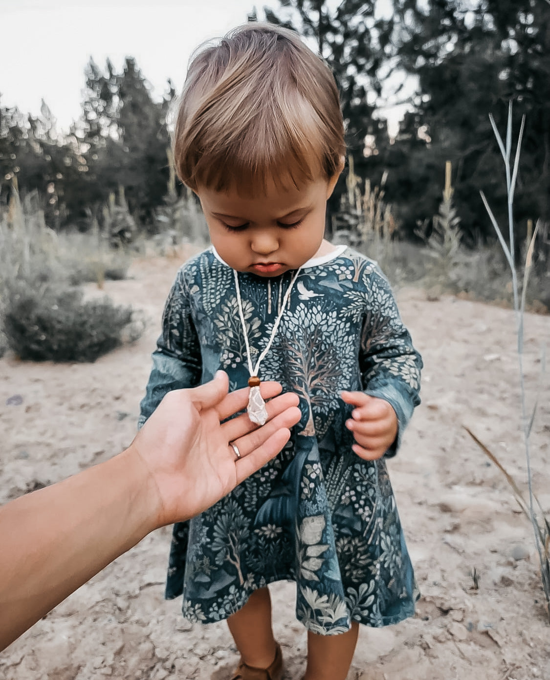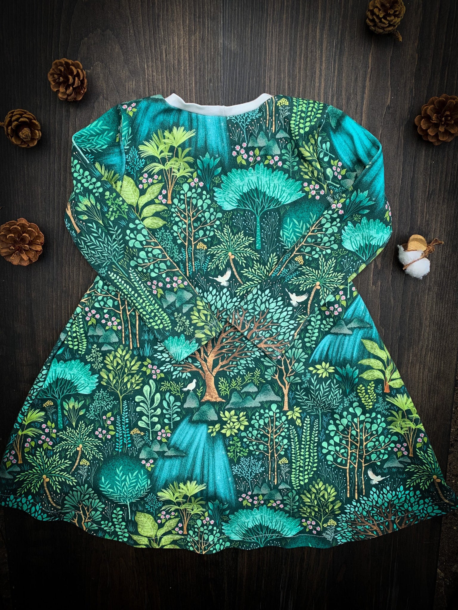Voyager Dress Organic Cotton Twirl Dress in Emerald Eden This dress is made out of a buttery soft, breathable organic cotton that gets softer with each wash. This will be a staple in your child's wardrobe. Can be worn alone in warmer climates & layered with a sweater and tights during cooler months.